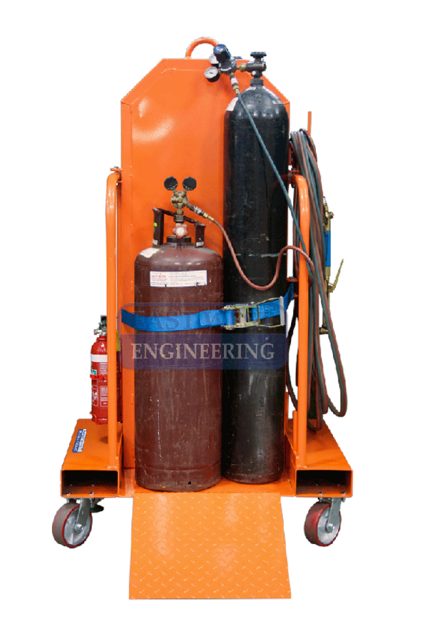This versatile Gas Cylinder Trolley is designed for the safe and efficient transportation and handling of gas cylinders and can accommodate two size ‘G’ Oxygen and two size ‘G’ Acetylene cylinders, or a single LPG cylinder. Featuring a load binder for cylinder security, a removable loading ramp for ease of loading/unloading, internal storage to keep hoses neatly contained within the cage area, as well as a fire extinguisher, this Gas Cylinder Trolley can be be lifted by an overhead crane or forklift and is also is equipped with two fixed and two swivel 150mm diameter castors for manual handling.